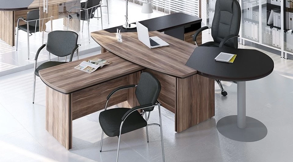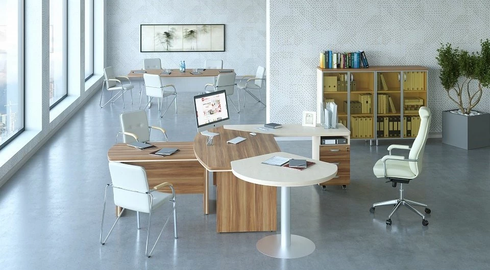Первый цвет – дрифтвуд. Это довольно строгий и очень стильный выбор. Хорошо смотрится в сочетании с деталями белого или светло-серого цвета. Кокоболло является вторым решением. Это светлое оформление, которое смотрится ярко и свежо. Мерано-коричневый имеет интересную особенность в виде довольно четких полосок, которые добавляют стильный акцент в оформление офиса. Такие линии, воссоздающие рисунок дерева на срезе хорошо подчеркивают разнообразие линий и форм самой мебели. Береза – классическое оформление, которое способно сделать даже небольшую комнату просторной. Орех табак наиболее темный из всех доступных цветов.