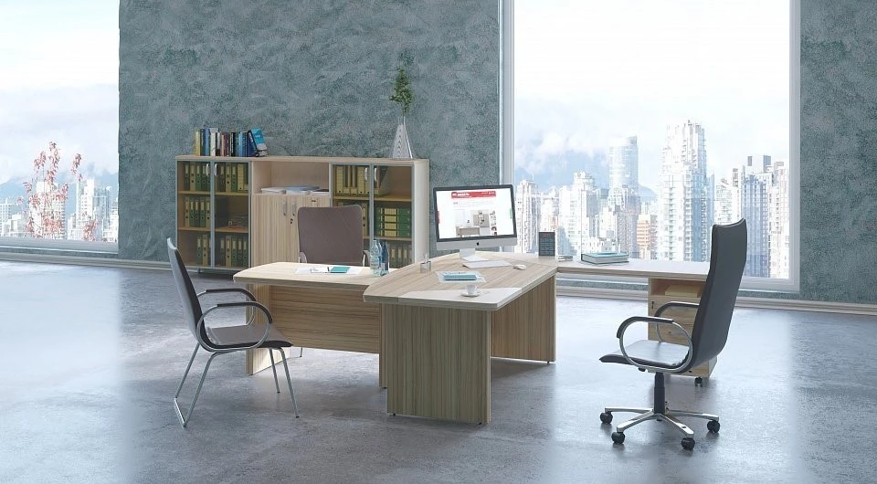Набор несложно дополнить некоторыми аксессуарами, мягкой мебели для. За счет модерности комплекта, любая офисная техника смотрится на нем уместно. Данный кабинет хорошо подойдет практичному руководителю, который любит все держать под рукой, при этом не загромождая лишнее пространство.