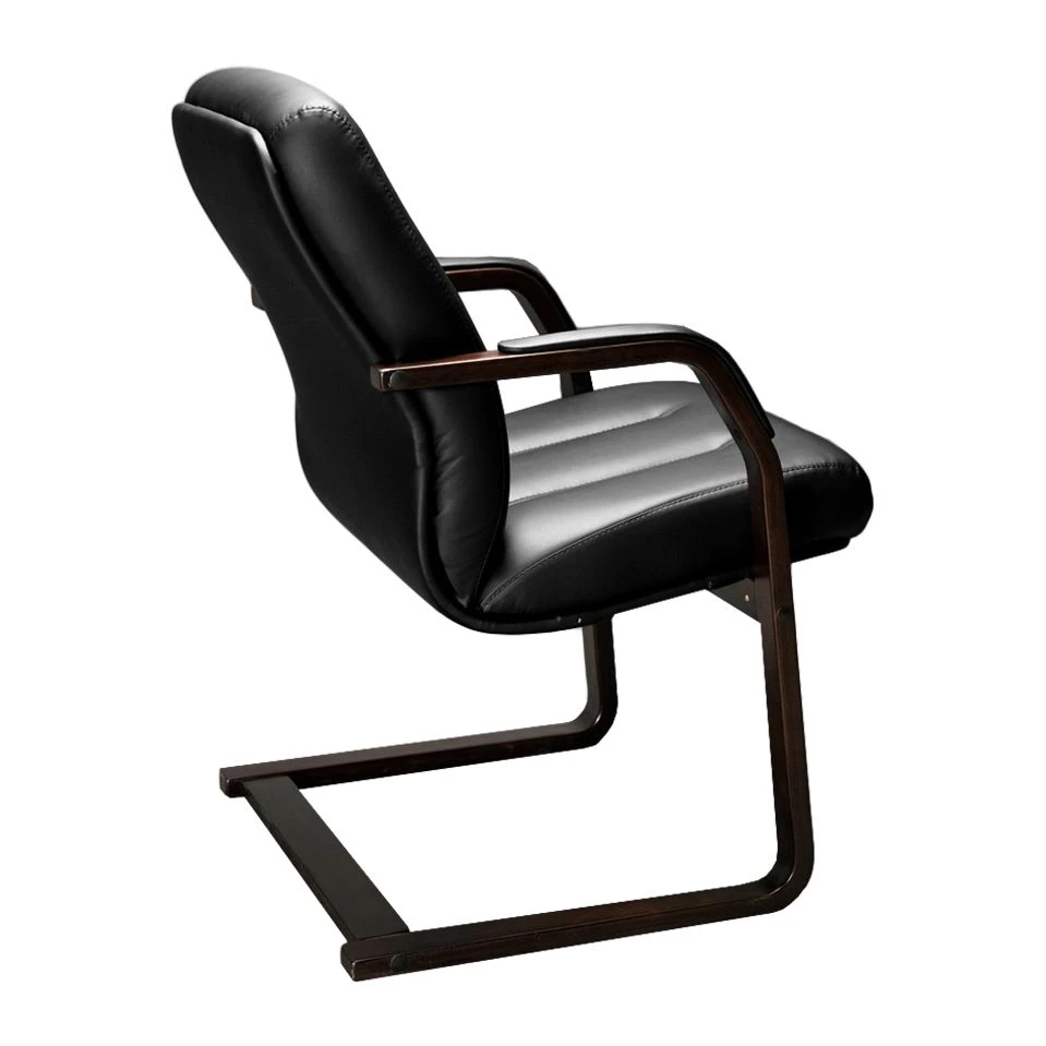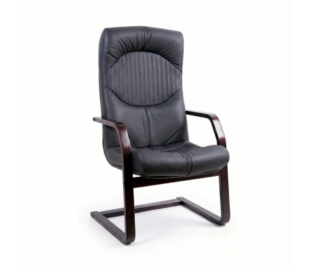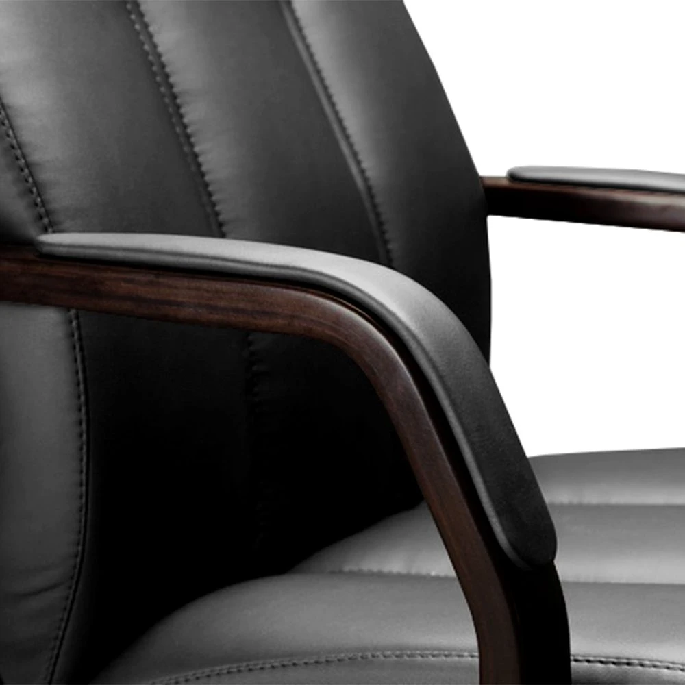 Деревянные подлокотники для повышения комфортабельности имеют мягкие накладки из экокожи, человеку будет комфортно ожидать приема или участвовать в конференции. Продольная строчка служит не только декоративным элементом, но и обеспечивает удобную посадку, не давая телу менять положение.